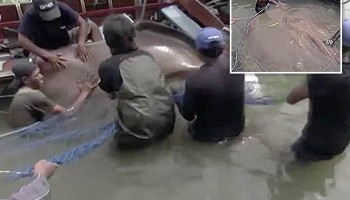 شاهد.. مجموعة من الصيادين يعثرون على وحش بحري