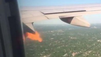 شاهد اشتعال النيران في محرك طائرة وهبوطها اضطراريا