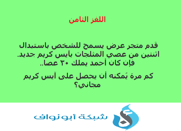 حل اللغز الثامن: 19 مرة. فيجب الأخذ بعين الاعتبار أنه في كل مرة يستبدل يحصل على عصا إضافية من الآيس كريم الذي يأخذه.