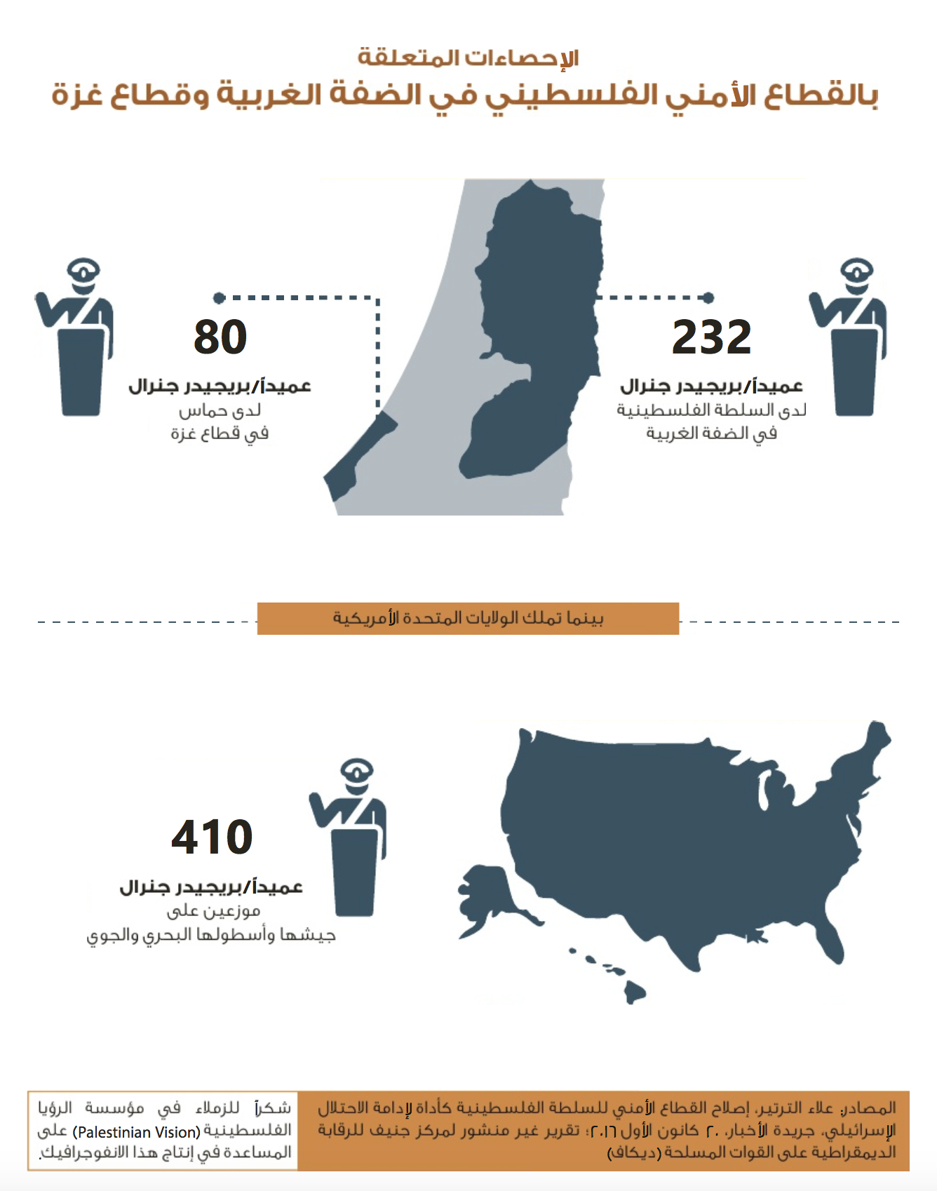 وأشارت الدراسة إلى وجود 232 عميد لدى الأجهزة الأمنية في الضفة الغربية، مقابل 30 عميد لدى حماس، بينما يوجد 410 عميداً موزعين على الجيش الأمريكي وأسطولها البحري والجوي.