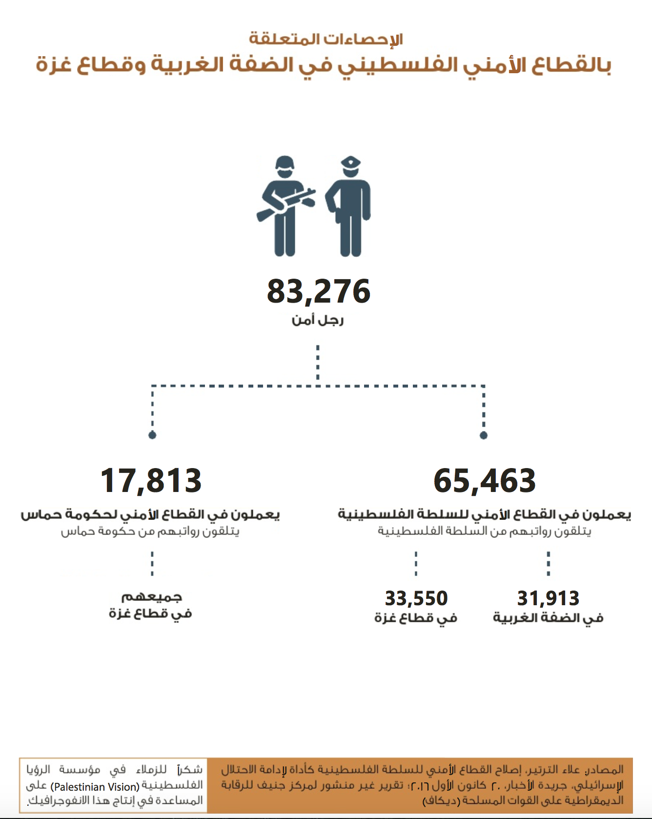 وجاء في الدراسة التي أعدها الباحث الفلسطيني علاء الترتير، مدير برامج شبكة السياسات الفلسطينية (الشبكة)، أن عنصر أمن واحد لكل 48 مواطن فلسطيني يعيشون في الضفة الغربية وقطاع غزة.