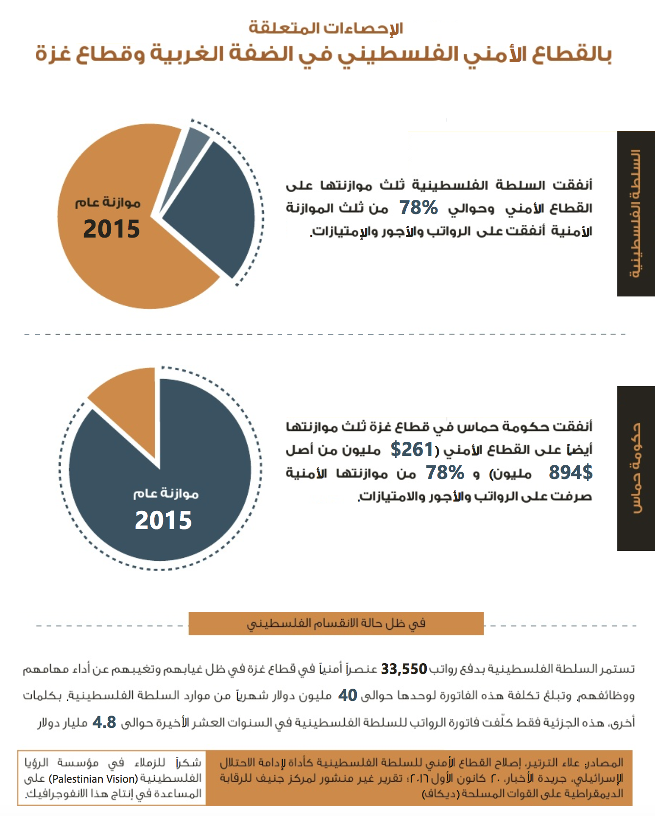يذكر أن فاتورة وزارة الداخلية والأمن الفلسطينية، تشل سنوياً ما نسبته 29% - 31% من موازنة الحكومة الفلسطينية، بقيمة متوسطة تبلغ مليار دولار أمريكي سنوياً.