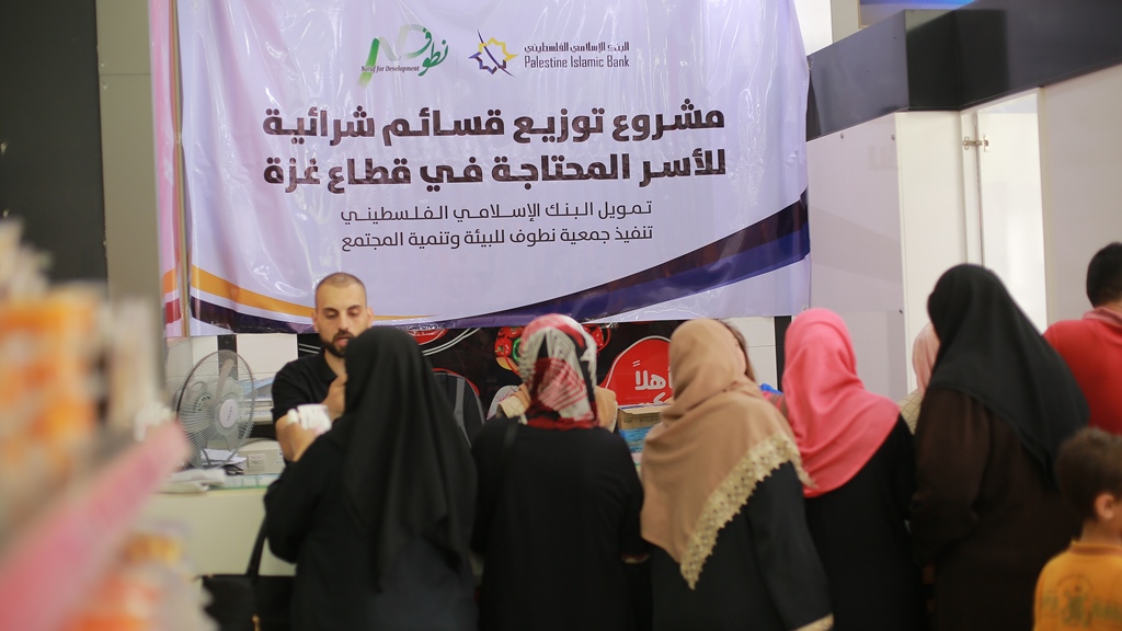 وقالت ضحى الوزني مدير العلاقات العامة في البنك الإسلامي الفلسطيني أنه خلال رمضان، تم توزيع ما يزيد عن 300 قسيمة شرائية مكونة من الخضروات واللحوم والمواد الغذائية للأسر المستورة، وأن نحو 100 قسيمة كانت بتبرع من موظفي البنك الذي استجابوا لحملة بالتبرع براتب يوم واحد لصالح أهل القطاع المحاصر.