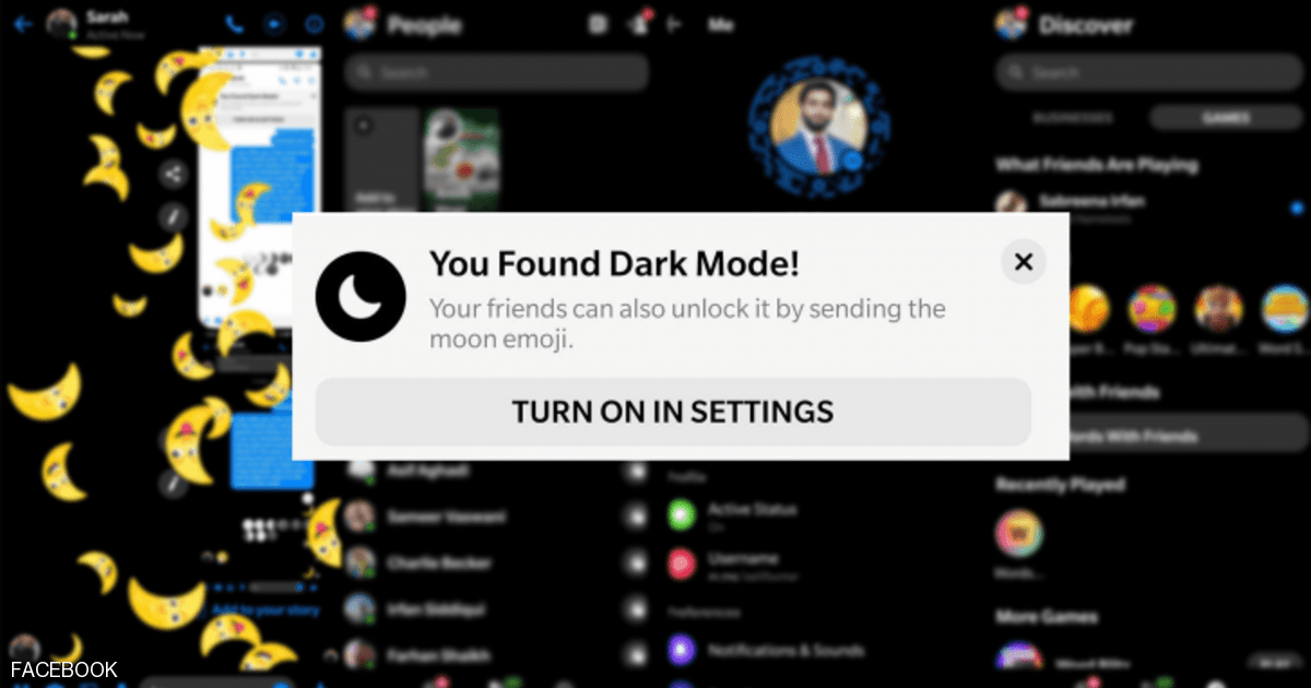 وبحسب موقع "لايف هاكر"، فإن تفعيل الوضع المظلم في تطبيق ماسنجر بات ممكنا من خلال بعث رسالة تضم إيموجي الهلال لأي شخص من الأصدقاء في فيسبوك.