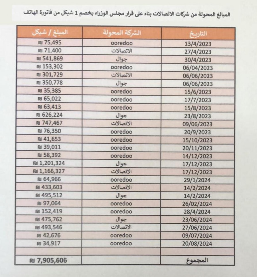 الاقتصادي- أعلنت وزارة المالية، اليوم الأربعاء، أن إجمالي المبالغ المحصلة بناء على تنفيذ "قرار بقانون رقم (1) لسنة 2023 بشأن المساهمة في مشاريع تطوير القدس عبر خط الهاتف"، والمتعلق بخصم "شيكل القدس" من الفواتير الشهرية لمشتركي الهاتف الثابت والمحمول، بلغ (7,905,606) شيكل خلال الفترة من 4/2023 وحتى 8/2024.