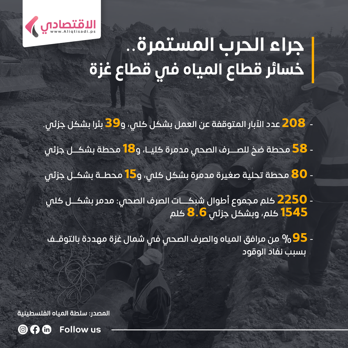 الاقتصادي - قالت سلطة المياه إن التقديرات الحالية لحجم الخسائر التي لحقت بقطاع المياه خلال العدوان المستمر على قطاع غزة تزيد على 80% في مرافق قطاع المياه، ويشمل ذلك الآبار ومحطات الضخ ومحطات التحلية، وشبكات التوزيع، ومحطات الصرف الصحي.