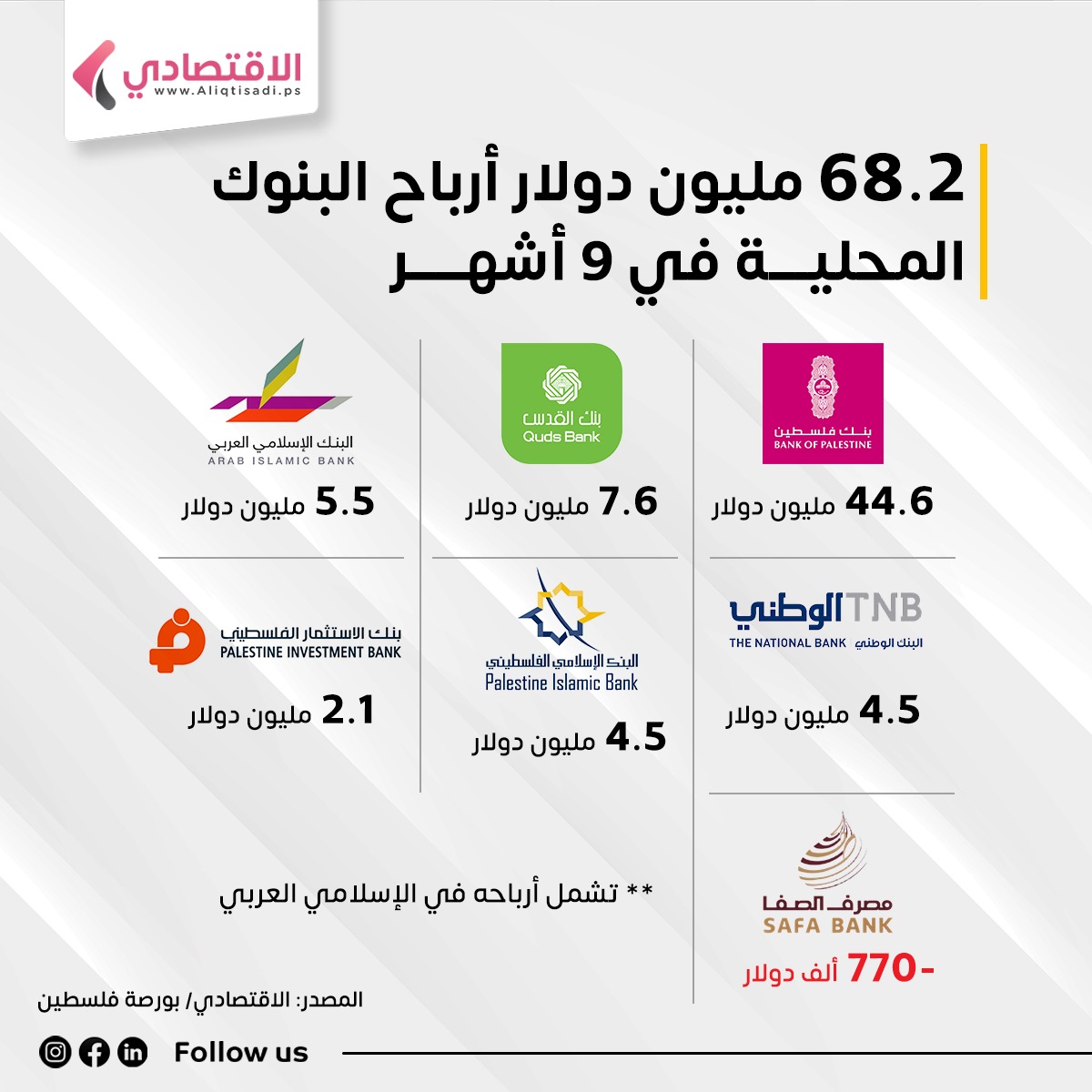 وتصدر بنك فلسطين قائمة أرباح البنوك المحلية في أول 9 أشهر من العام الجاري بـ44.6 مليون دولار بعد أن كانت خسائره لذات الفترة من العام المنصرم 17.9 مليون دولار.