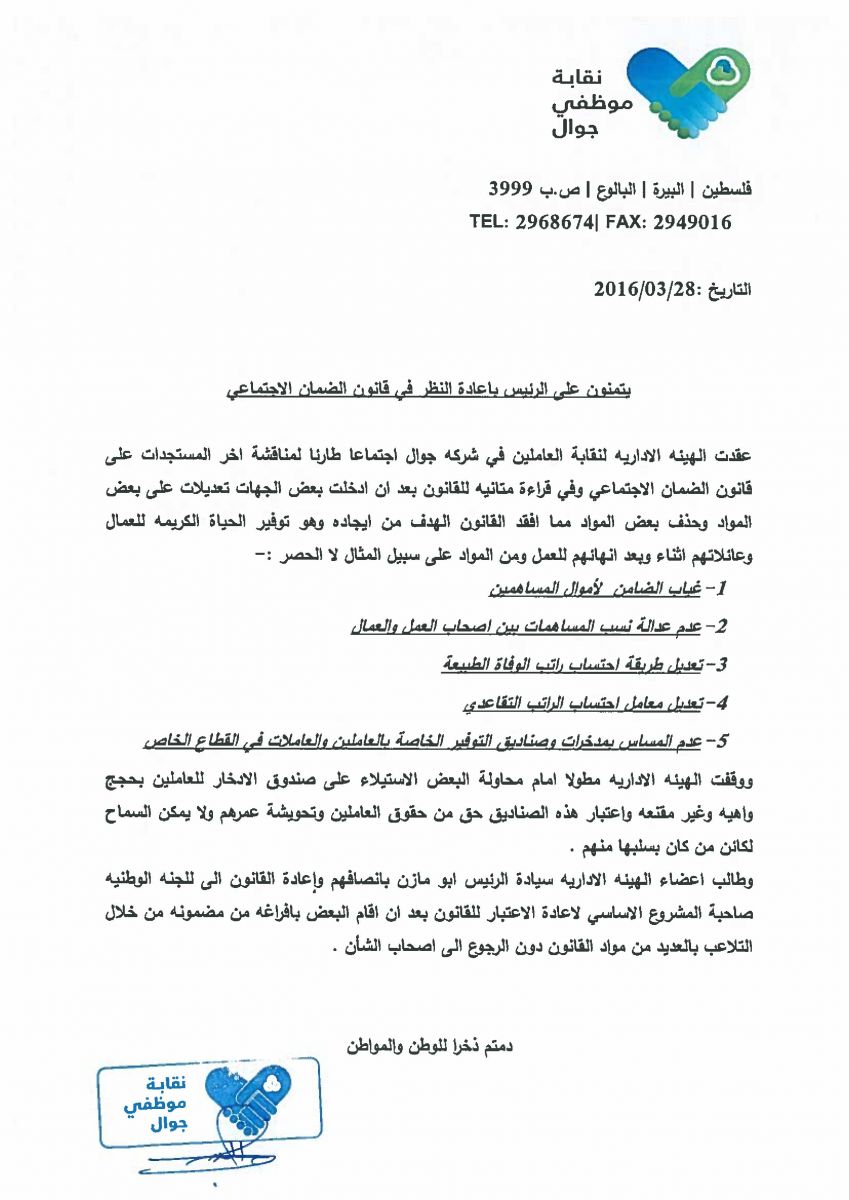 رام الله- الاقتصادي- طالبت نقابة موظفي "جوال" الرئيس محمود عباس بالإنصاف تعقيباً على قانون الضمان الاجتماعي الذي صدر مؤخراً، وإعادته للجنة الوطنية صاحبة المشروع الأساسي، بعد أن "قام البعض بإفراغه من مضمونه".