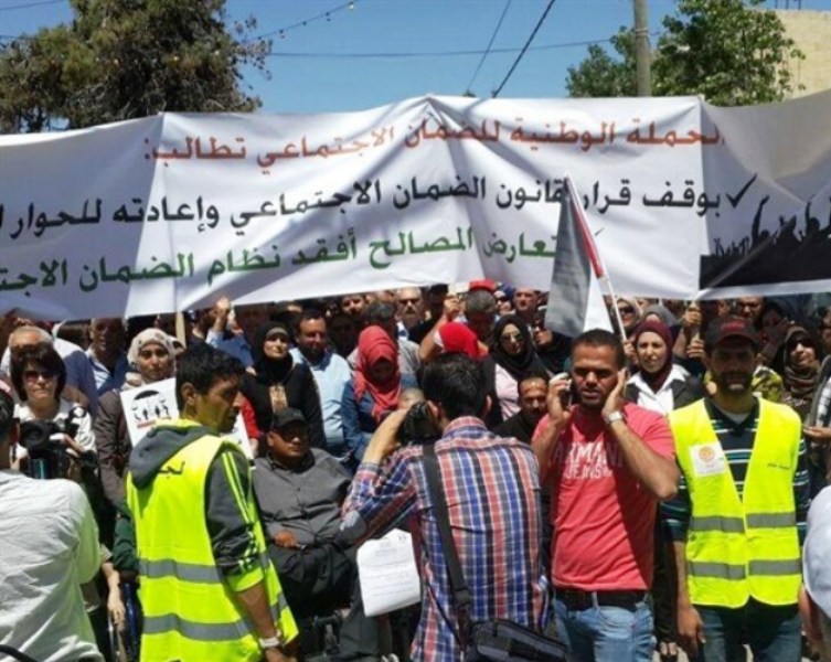 احتشد آلاف المواطنين في مسيرة أمام مجلس الوزراء في رام الله احتجاجاً على قانون الضمان الاجتماعي والذي اعُتبر مجحفاً في حق المواطنين ولا يلبي حقوق الفئات المهمشة.