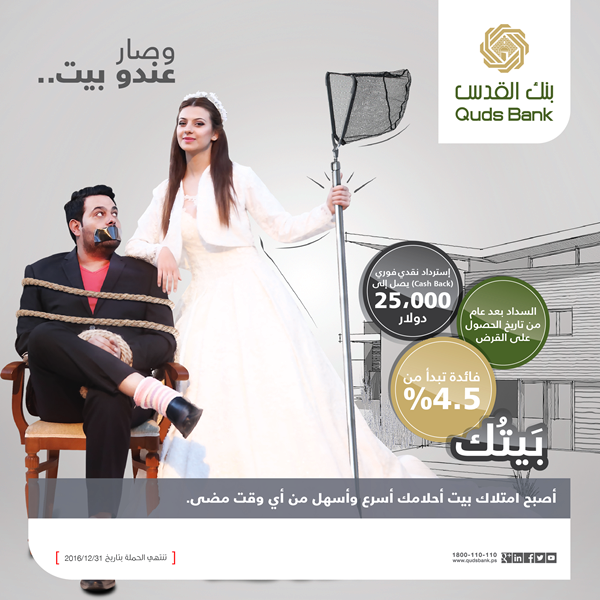 أعلن بنك القدس عن إطلاق حملة جديدة على قروض الاسكان بعنوان "بيتك" وذلك في إطار استراتيجية بنك القدس لتقديم حملات وخدمات مصرفية مميزة للمواطنين، وتشمل الحملة الجديدة مزايا فريدة، تشمل استرداد نقدي (cash Back) يصل إلى 25,000 دولار أو فائدة تبدأ 4.5% أو امكانية بدء السداد بعد عام من تاريخ منح القرض.