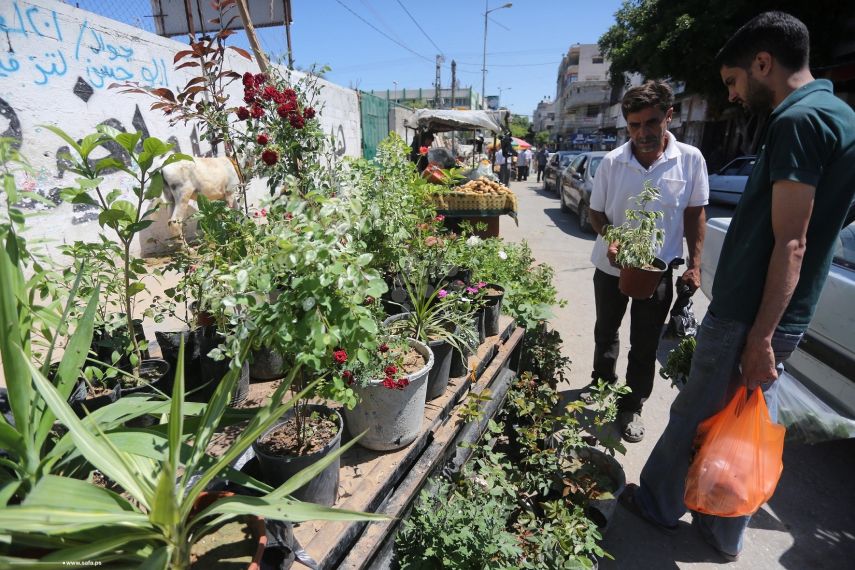 مدينة غزة، على مقربة من عربته التي تحمل مجموعة مُنوّعة من الأشتال والأشجار الصغيرة.