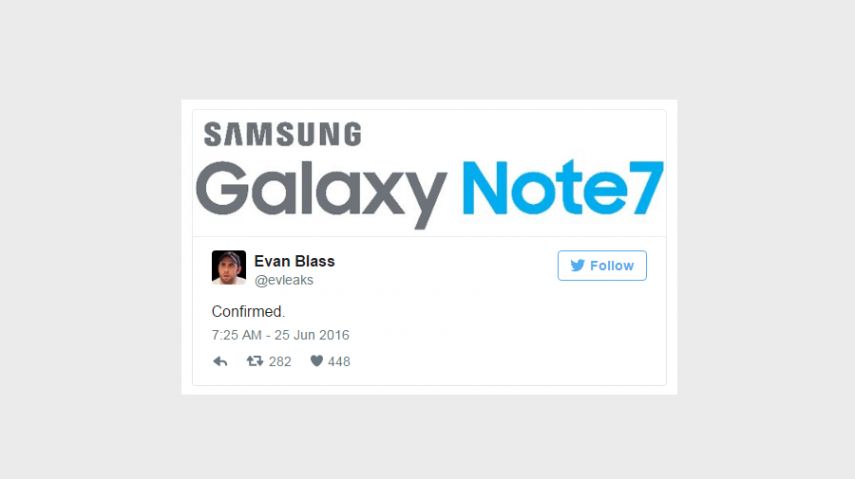 ونشر بلاس، صاحب حساب Evleaks@ المعروف بتسريباته الدقيقة، تغريدة على تويتر مع صورة باسم الهاتف: “سامسونج جالاكسي نوت 7″، وعبارة “مؤكد”.