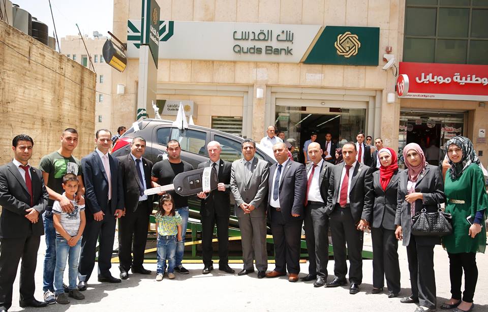 وتم تسليم السيارة للفائز محمد هيموني خلال حفل اقيم في فرع الخليل بحضور عدد من الشخصيات الاعتبارية وعملاء البنك، حيث رحبت إدارة بنك القدس بالحضور وهنأت الفائز وعائلته بالجائزة، كما تحدثت عن اهتمام البنك بتقديم كل ما هو جديد من خدمات مميزة وحملات منافسة للمواطنين وخطة البنك للتفرع والوصول الى المواطن الفلسطيني في جميع المناطق حيث حاز البنك مؤخراً على الموافقات اللازمة لافتتاح مكتبين مصرفيين له في كل من بلدتي قبلان وجماعين في محافظة نابلس، ومكتبين أخريين في الظاهرية وترقوميا في محافظة الخليل ومكتب آخر في الشجاعية بقطاع غزة.