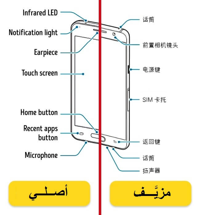 لكن حتى إن كانت الأجهزة المُقلدة مُشابهة للأصلية إلى حدٍ كبير، يُمكن ملاحظة بعض الاختلافات البسيطة التي لا تظهر جليةً للعيان، لكن التدقيق في الجهاز يكشف عن هذه الاختلافات.