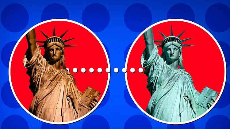 وكشف فيديو جديد عن التفاعلات الكيميائية الناتجة من الأوكسيجين وتلوث الهواء، الذي أدى إلى تغير لون تمثال الحرية الموجود في نيويورك، من النحاسي إلى الأخضر.