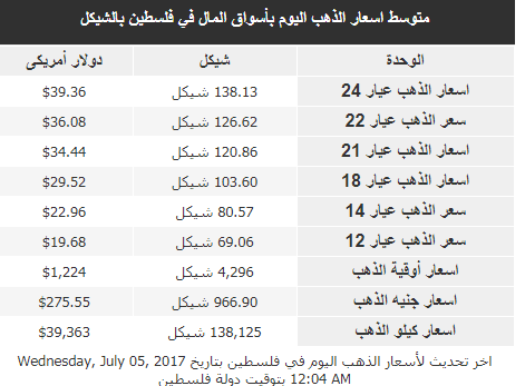 رام الله - الاقتصادي - جاءت اسعار غرام الذهب، في الاسواق المحلية، اليوم الاربعاء، لعيارات 18.21.22.24 على النحو التالي :-