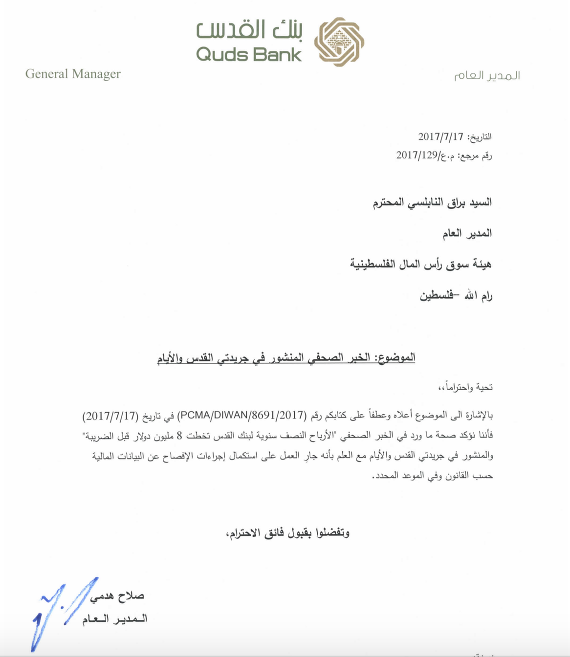 وأكد بنك القدس خبر الأرباح في إفصاح لبورصة فلسطين اليوم الإثنين، رداً على استفسار من هيئة سوق رأس المال، بشأن صحة الخبر الذي نشره الاقتصادي أمس ووسائل إعلام محلية منها جريدتي القدس والأيام، بشأن أرباحه نصف السنوية.