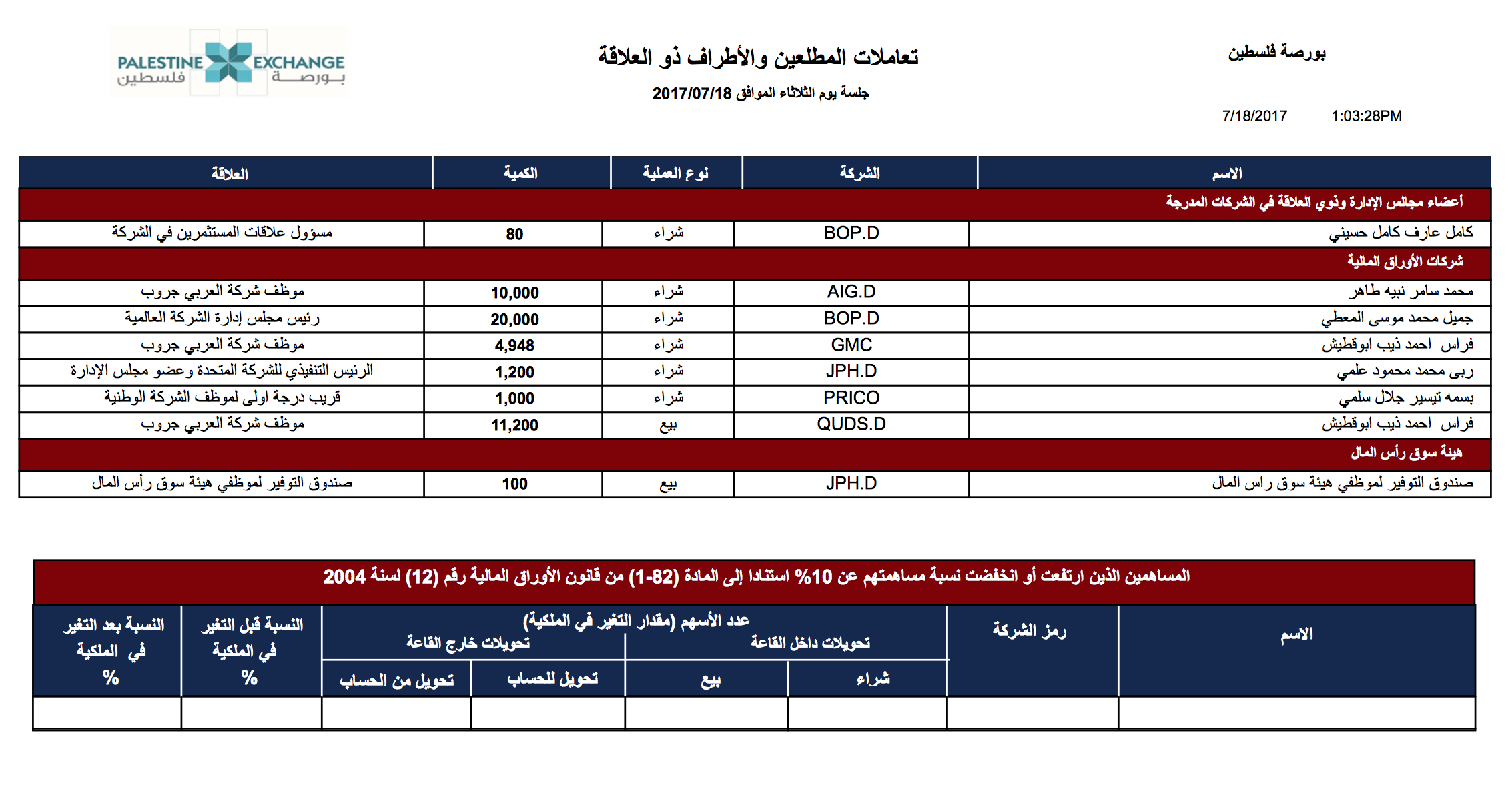 الثلاثاء.. هذه هي أبرز تداولات المطلعين في بورصة فلسطين