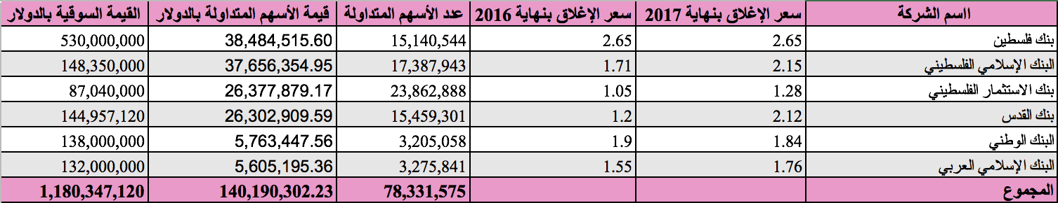 في الجدول التالي، ترتيب البنوك المدرجة في بورصة فلسطين، من حيث حجم النشاط في بورصة فلسطين خلال العام الماضي 2017:
