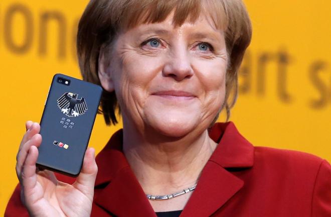 أما المستشارة الألمانية أنجيلا ميركل فإن هاتفها من نوع بلاكبيري يرسل بيانات مشفرة، ويحمي المكالمات الهاتفية من التنصت، كما يوفر رابطاً آمناً إلى شبكة الحكومة الألمانية الداخلية، ويرسل رسائل إلكترونية عبر شبكة افتراضية خاصة.