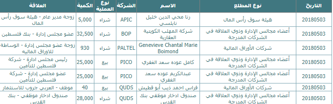 خاص الاقتصادي - بينت معطيات رسمية صادرة عن بورصة فلسطين، اليوم الخميسء، ان7 صفقات تداول (بيع وشراء)، تمت من جانب أفراد أو مؤسسات مطلعة على أداء الشركات، أو ذات علاقة بها.