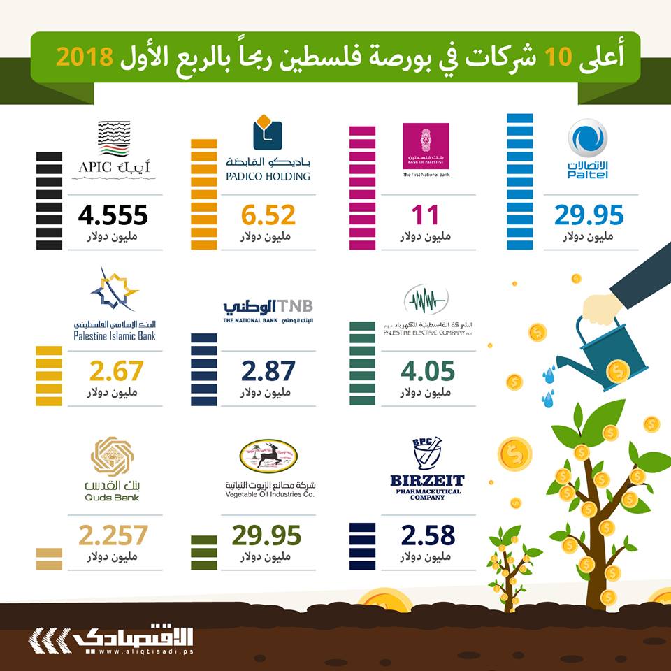 - في المرتبة الرابعة، جاءت العربية الفلسطينية للاستثمار "أيبك"، التي سجلت صافي أرباح في الربع الأول 2018، بلغت 4.555 مليون دولار.