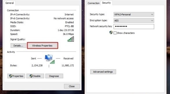 وفي النافذة التالية يتم النقر على "خصائص الشبكة اللاسلكية"، وفي مربع الحوار التالي يتم النقر على بند "إظهار الحروف" في علامة التبويب "الأمان"، وعندئذ تظهر كلمة المرور بحروف واضحة.