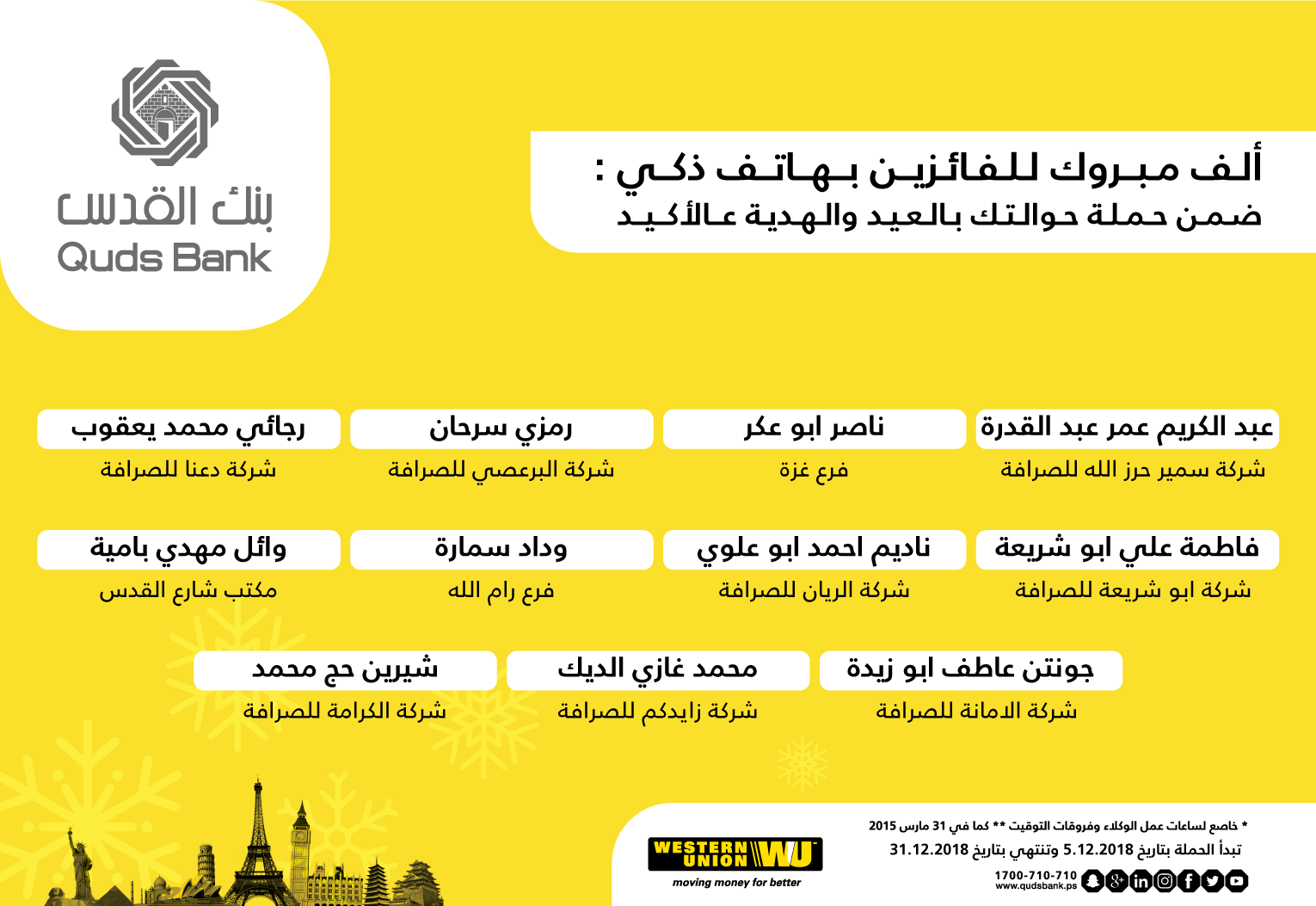 رام الله - الاقتصادي - أعلن بنك القدس مؤخرا عن قائمة الرابحين المحظوظين بجائزة جهازهاتف ذكي ضمن الحملة التي تم إطلاقها على خدمة تحويل الاموال ويسترن يونيون لمناسبة أعياد الميلاد المجيد ورأس السنة الميلادية بعنوان "حوالتك بالعيد والهدية على الأكيد".