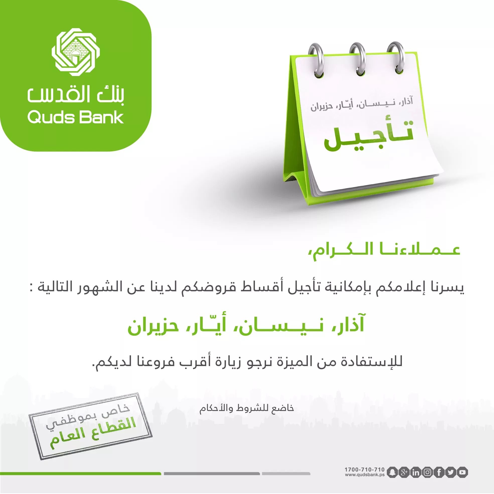 وجاء في إعلان لبنك القدس نشره اليوم، أنه أصبح بإمكان عملائه من موظفي القطاع العام، تأجيل أقساط قروضهم عن شهور مارس/ آذار حتى يونيو/ حزيران 2019.