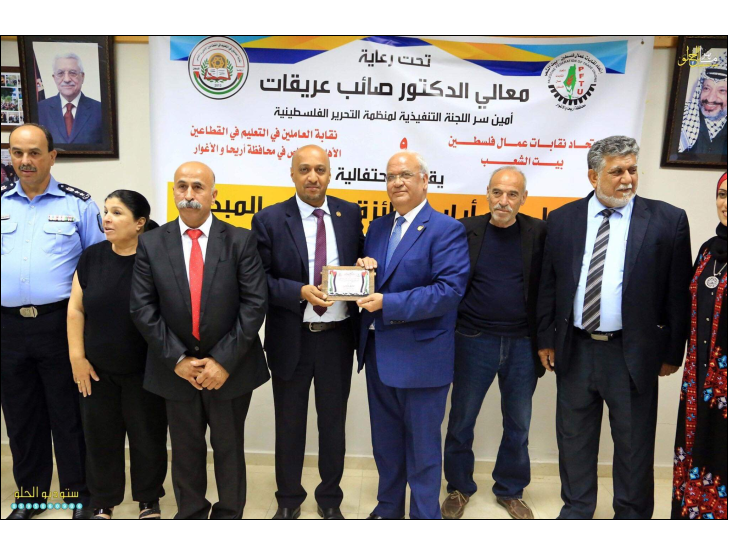 وأقيمت الاحتفالية موخراً في مبنى إتحاد نقابات العمال في محافظة أريحا بحضور أمين سر اللجنة التنفيذية لمنظمة التحرير الفلسطينية د. صائب عريقات، ومحافظ محافظة أريحا جهاد أبو العسل ومدير فرع بنك القدس في أريحا خليل مغربي ورئيس إتحاد نقابات العمال السيد وائل نظيف ورئيس نقابة المعلمين في القطاعين الأهلي والخاص السيد كايد بوليس وعدد من الشخصيات الرسمية والأمنية في محافظة أريحا ومختلف القيادات التربوية والمعلمون والمعلمات في المدارس، وجمع من الاهالي والاصدقاء.