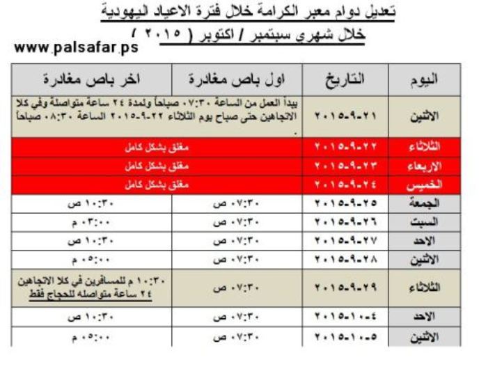 رام الله- الاقتصادي- أعلن مدير عام الادارة العامة للمعابر والحدود في السلطة الوطنية الفلسطينية نظمي مهنا مساء اليوم الخميس، عن إغلاق معبر الكرامة بشكل كامل في اليوم الأول من عيد الأضحى، وكذلك إجراء تعديل في ساعات عمل المعبر نفسه في كلا الاتجاهين وذلك خلال الأعياد اليهودية حيث من المقرر أن يعمل المعبر كما هو موضح في الجدول المرفق.