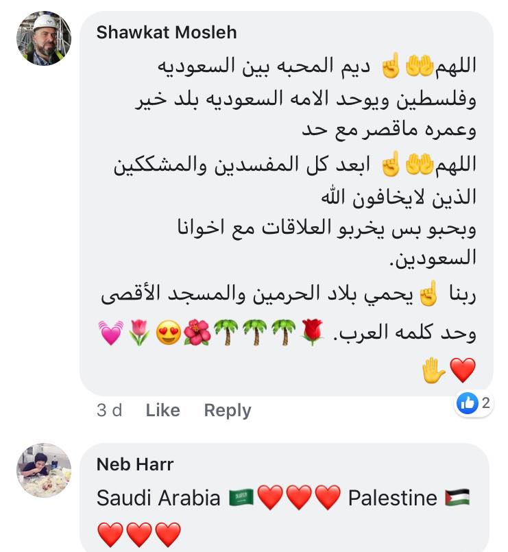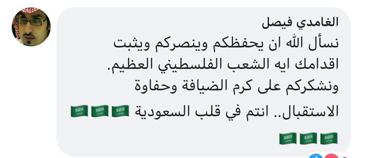 ومن خلال التعليقات، شكر السعوديون أهل فلسطين على استقبالهم الرائع للمنتخب السعودي مؤكدين على وقوفهم بجانب الفلسطينيين ومتمنيين دخولها والصلاة في المسجد الأقصى.