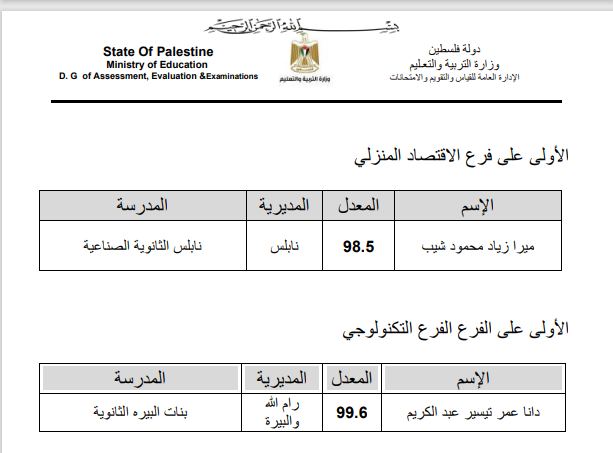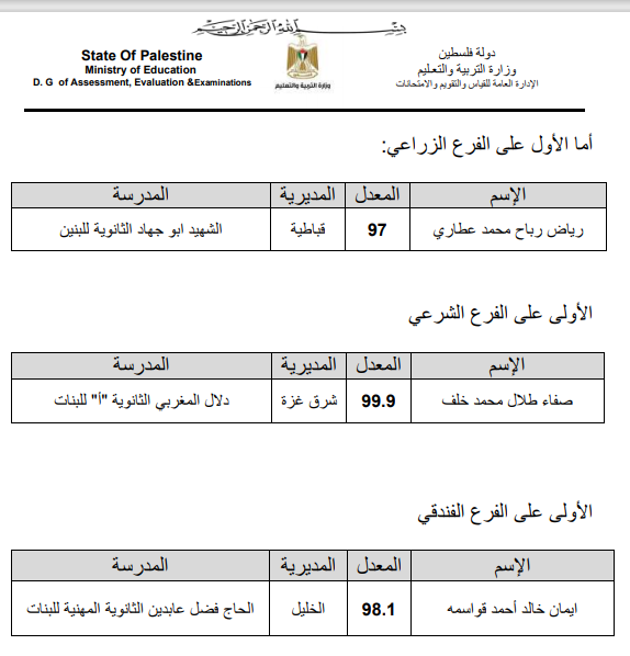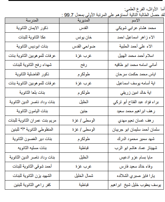 اسماء العشرة الاوائل على الضفة وغزة في كافة الفروع: -
