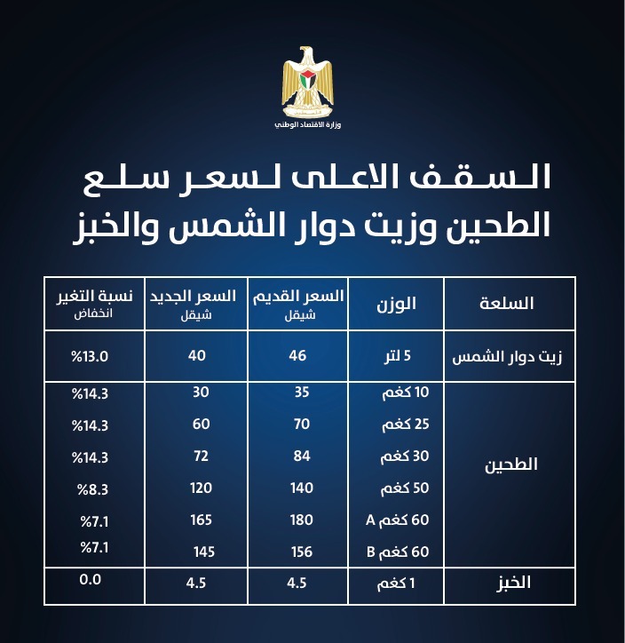 وفي بيان وصل "الاقتصادي"، حددت الوزارة السقف السعري الاعلى لهذه السلع، بانخفاض يتراوح بين 7%-14% بعد تراجع أسعارها للشهر الخامس عالمياً مع ثبات  كيلوغرام الخبز المحدد بـ4.5 شيقل، لافته الى أن الأسعار ملزمة للتجار تحت الطائلة المسؤولية القانونية.