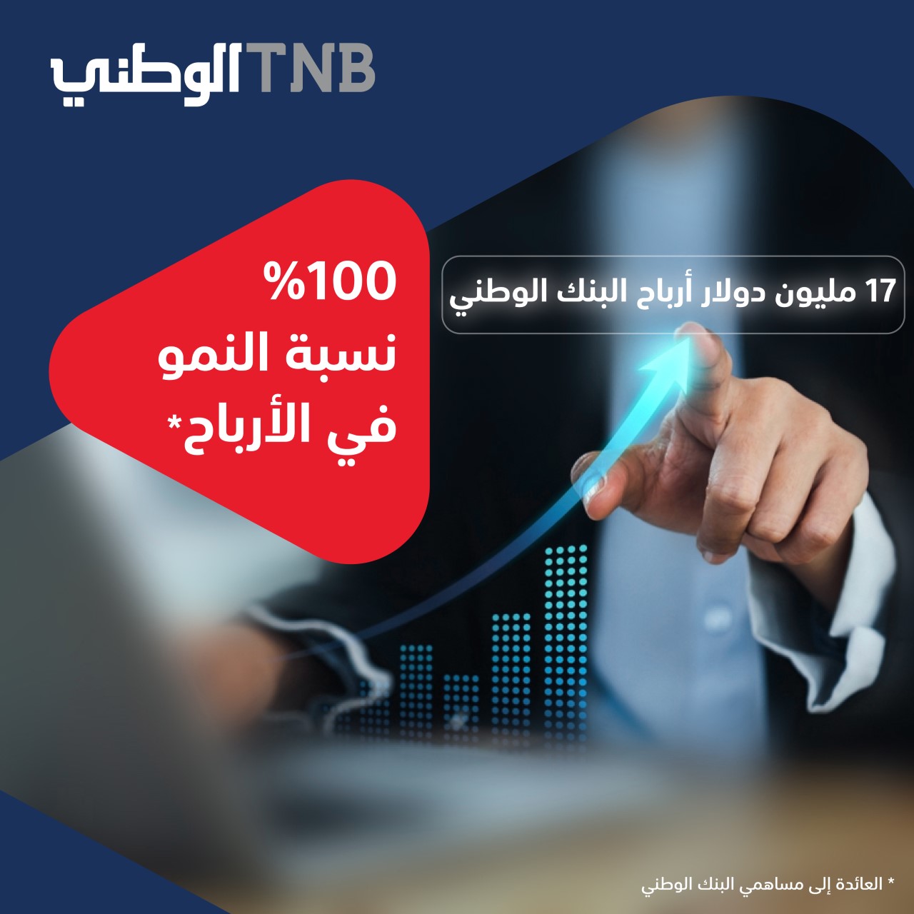 الاقتصادي- أعلن البنك الوطني عن نتائج بياناته المالية للعام المالي المنتهي في 31 ديسمبر2022، حيث حقق أرباحا صافية عائدة لحقوق المساهمين بقيمة 17 مليون دولار أمريكي، مقارنة مع 8.5 مليون دولار أمريكي نهاية العام 2021، وبنسبة نمو بلغت 100%.