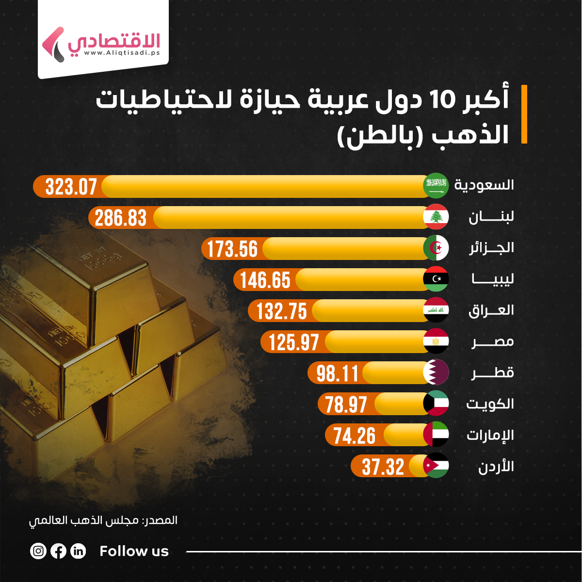 الاقتصادي- جاءت المملكة العربية السعودية في المرتبة الأولى في قائمة أكبر 10 دول عربية حيازة لاحتياطيات الذهب، وفق مجلس الذهب العالمي.