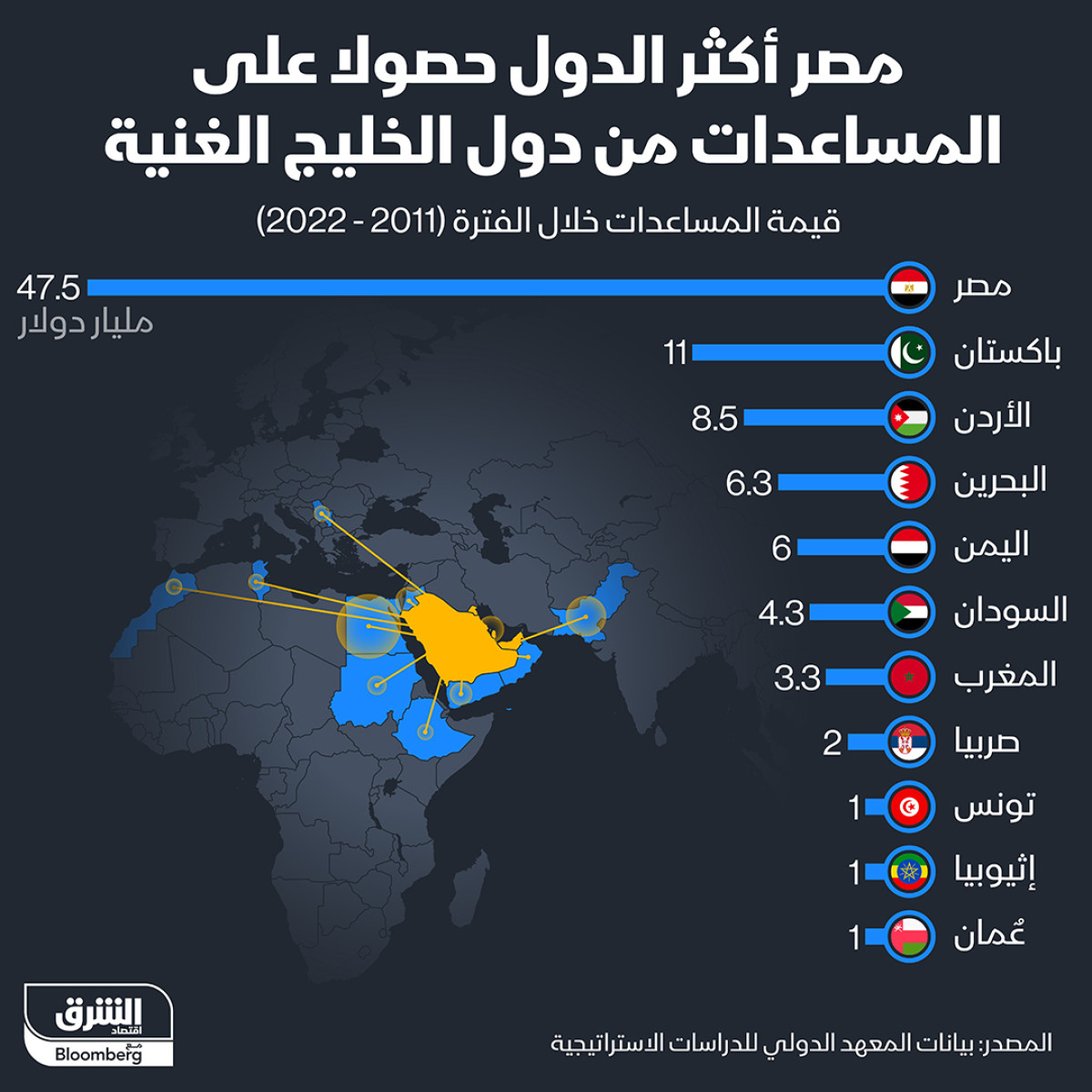 الاقتصادي - بلغ إجمالي قيمة المساعدات التي تلقتها مصر من دول الخليج 47.5 مليار دولار خلال الفترة بين 2011 و2022، ما يضعها في طليعة قائمة متلقي هذه المساعدات، بحسب بيانات المعهد الدولي للدراسات الاستراتيجية.