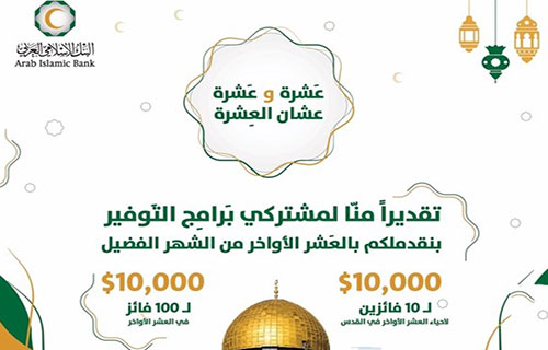 رام الله - الاقتصادي - أطلق البنك الإسلامي العربي، بالإضافة لبرامج التوفير القائمة، حملة رمضان الجديدة "عَشرة وعَشرة عشان العِشرة" لتكون واحدة من الحملات المتميزة لدى البنك، والتي من خلالها يتيح البنك لأكبر عدد من عملائه القدامى الفوز بالجوائز التالية: 10,000 دولار لعشرة فائزين لإحياء العشرة الآوخر من رمضان في القدس الشريف، و10,000 دولار لعشرة فائزين يومياً بالعشرة الآواخر من رمضان.